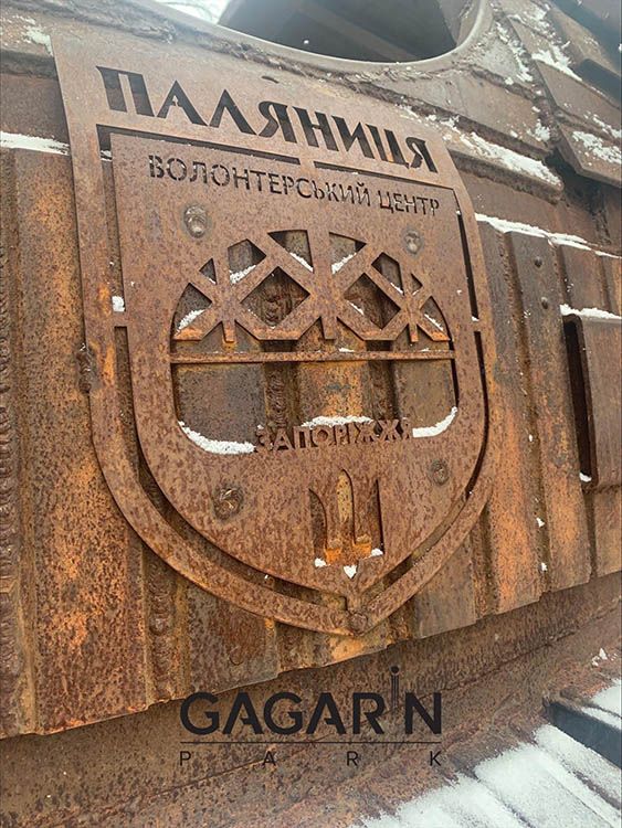 Артоб’єкт зроблений з автомобільних ресор і важить аж 2,5 тони. На початку війни бронежилети саме з цього матеріалу врятували сотні життів. Автор скульптури - житель Запоріжжя Євген Балагун. З лютого він працює в волонтерському центрі «Паляниця», де і виготовлялася така амуніція для захисників України.