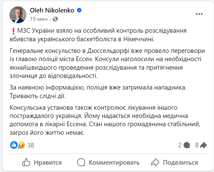 За наявною інформацією, поліція вже затримала нападника. Тривають слідчі дії. Консульська установа також контролює лікування іншого постраждалого українця. Йому надається необхідна медична допомога в лікарні Ессена. Стан нашого громадянина стабільний, загроз його життю немає, - написав Олег Ніколенко.