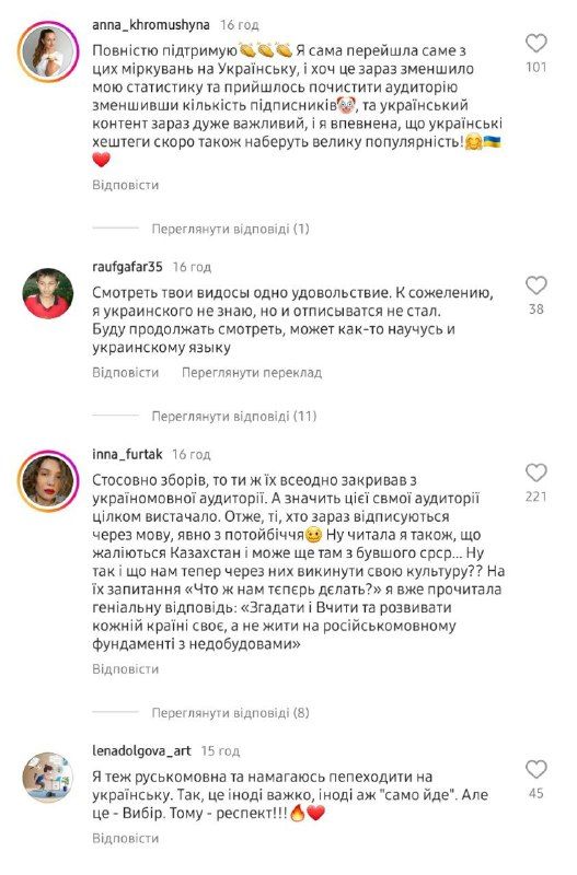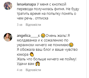 Звісно, є і незадоволені, і засмучені користувачі: "У меня с кнопкой перевода получилась фигня. Не буду тратить время на попытку понять о чем речь. отписка", "Очень жаль! Я молдаванка и, к сожалению, по-украински ничего не понимаю.. Я обожала ваш блог и ваше чувство юмора. Жаль, что больше ничего не пойму! Удачи вам".