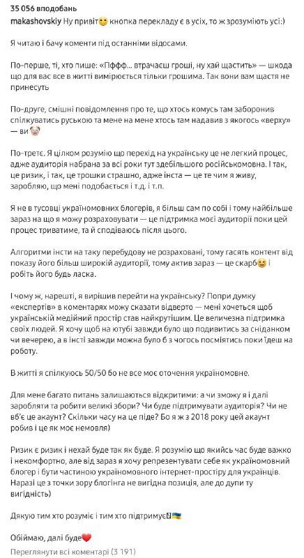 І чому ж, нарешті, я вирішив перейти на українську? Попри думку «експертів» в коментарях можу сказати відверто — мені хочеться, щоб український медійний простір став найкрутішим. Це величезна підтримка своїх людей. Я хочу, щоб на ютубі завжди було що подивитись за сніданком чи вечерею, а в інсті завжди можна було б з чогось посміятись, поки їдеш на роботу.... Я розумію, що якийсь час буде важко і некомфортно, але від зараз я хочу репрезентувати себе як україномовний блогер і бути частиною україномовного інтернет-простору для українців. Наразі це з точки зору блогінга не вигідна позиція, але до дупи ту вигідність, - написав Кирило.