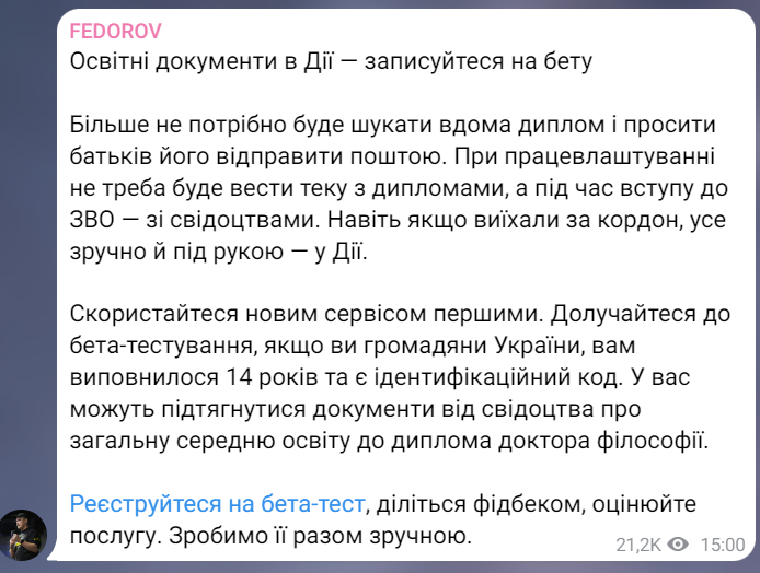 Скористайтеся новим сервісом першими. Долучайтеся до бета-тестування, якщо ви громадяни України, вам виповнилося 14 років та є ідентифікаційний код. У вас можуть підтягнутися документи від свідоцтва про загальну середню освіту до диплома доктора філософії, - зазначив міністр.