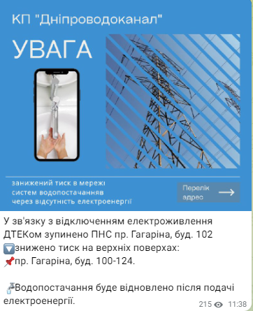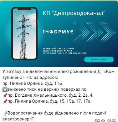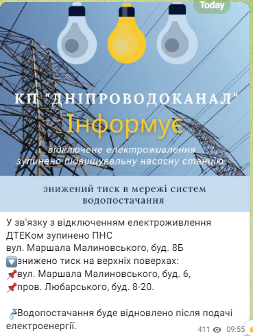 Так, у зв'язку з відключенням електроживлення зупинено ПНС на просп. Гагаріна, 102; вул. Маршала Малиновського, 8; просп. Пилипа Орлика, 11Б.