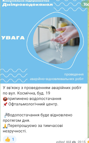 Також у зв'язку з проведенням аварійних робіт на вул. Космічній, 19 та вул. Немировича-Данченка, 38 припинено водопостачання: