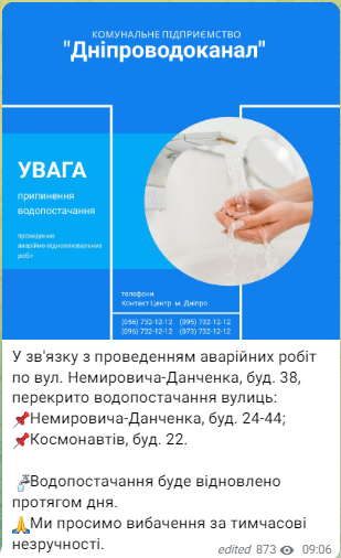 Сьогодні, 10 березня, деякі мешканці Дніпра залишилися без води.
