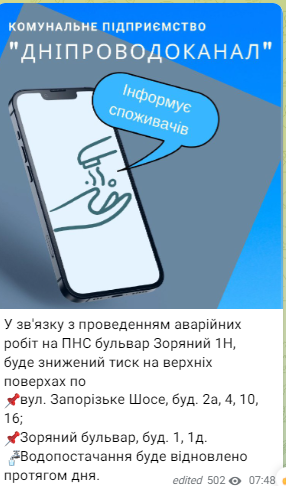 Крім того, у зв'язку з проведенням аварійних робіт на ПНС на бульварі Зоряному, 1Н знижено тиск на верхніх поверхах на