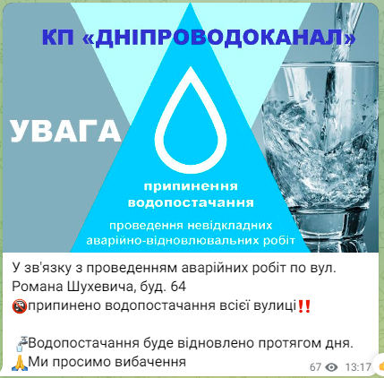 Відключення світла та аварійні роботи: де сьогодні у Дніпрі немає води