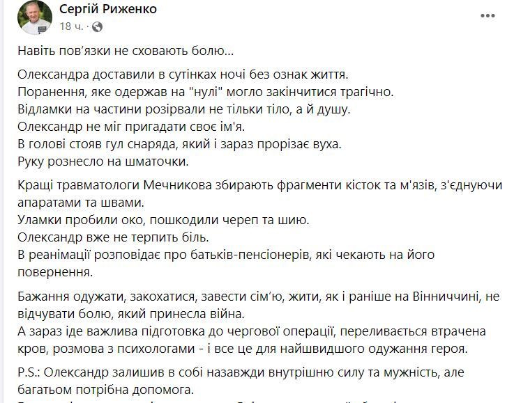 Бажання одужати, закохатися, завести сім’ю, жити, як і раніше на Вінниччині, не відчувати болю, який принесла війна. А зараз іде важлива підготовка до чергової операції, переливається втрачена кров, розмова з психологами - і все це для найшвидшого одужання героя. Олександр залишив в собі назавжди внутрішню силу та мужність, але багатьом потрібна допомога, - розповів лікар.