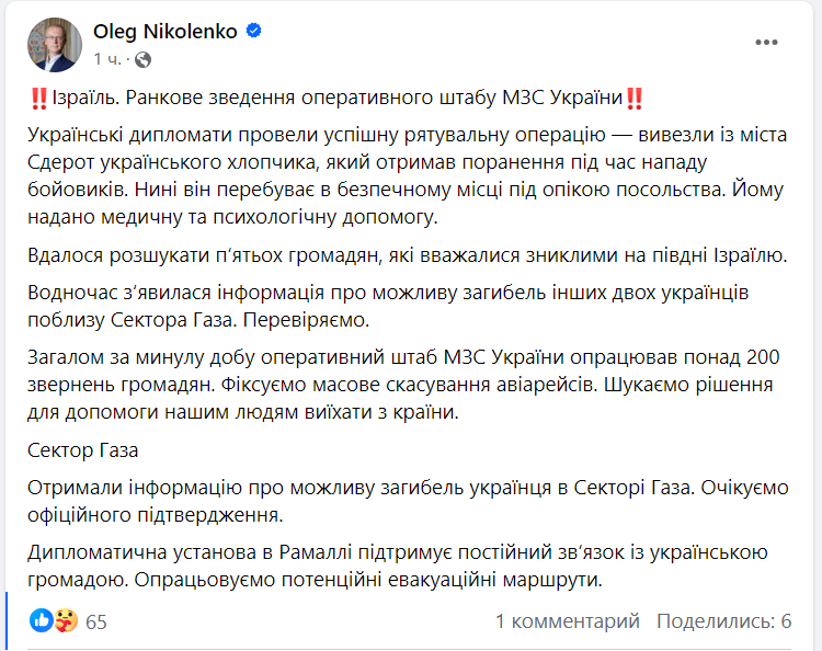 Крім того, вдалося знайти п'ятьох громадян, які вважалися зниклими на півдні Ізраїлю. Натомість з‘явилася інформація про можливу загибель інших двох українців в Ізраїлі та одного у секторі Гази, зараз її перевіряють.