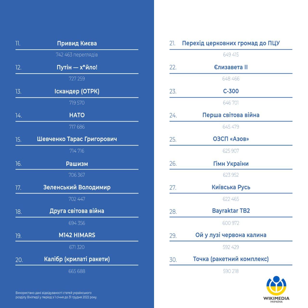 Так, на першому місці розмістилася стаття, присвячена початку повномасштабного вторгнення росії. Статтю «Російське вторгнення в Україну (2022)» відвідали понад 3,8 млн разів. На другому місці розмістилася стаття «Арестович Олексій Миколайович» (понад 2,2 млн переглядів), а на третьому – «Україна» (1,8 млн).