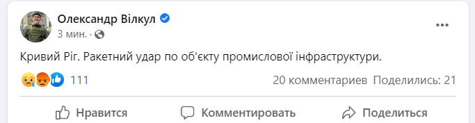 Як повідомив начальник військової адміністрації міста Олександр Вілкул, це був ракетний удар по об'єкту промислової інфраструктури.