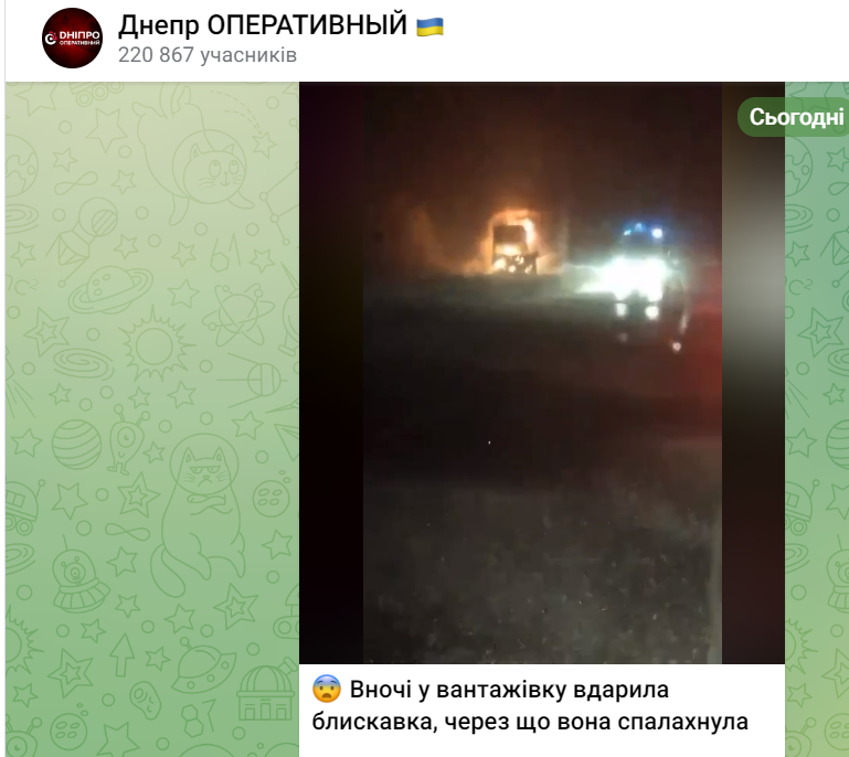 У ДСНС не зазначають, що стало причиною займання, а от Telegram-канал "Дніпро оперативний" повідомляє, що, за словами очевидців, у фуру влучила блискавка - через що вона і загорілася.