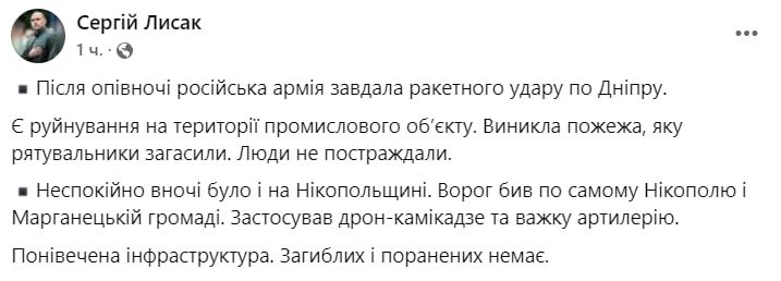Після опівночі ворог завдав ракетного удару по Дніпру. Внаслідок атаки є руйнування на території промислового об’єкту. Там виникла пожежа, яку вже загасили. На щастя, люди не постраждали.