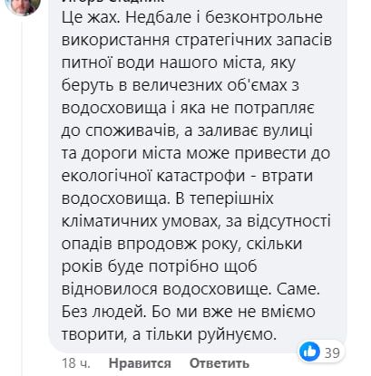 “Це жах. Недбале і безконтрольне використання стратегічних запасів питної води нашого міста, яку беруть в величезних об'ємах з водосховища і яка не потрапляє до споживачів, а заливає вулиці та дороги міста може привести до екологічної катастрофи - втрати водосховища. В теперішніх кліматичних умовах, за відсутності опадів впродовж року, скільки років буде потрібно щоб відновилося водосховище. Саме. Без людей. Бо ми вже не вміємо творити, а тільки руйнуємо”, - написав мешканець Кривого Рогу.