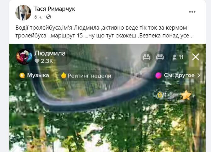 За словами жінки, водійка тролейбусу №15 вела прямий ефір в ТікТок під час роботи. Містянка вважає, що працівниця наражала на небезпеку своїх пасажирів, адже відволікалася він керування транспортом. Судячи з ніку в соцмережі, її звати Людмила.