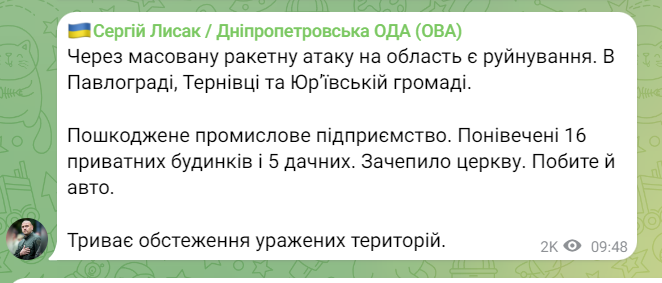 Ворог завдав масованого ракетного удару по Дніпропетровщині: Лисак розповів про наслідки