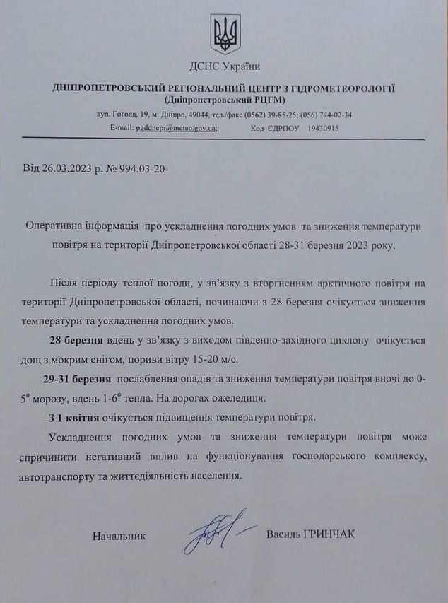 Так, з 28 по 31 березня в Дніпрі та області прогнозують погіршення погоди. Це пов'язано зі вторгнення арктичного повітря на територію регіону. Через це очікується зниження температури.