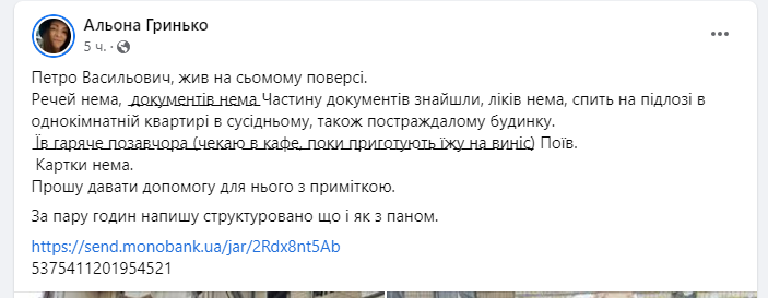 Про це пише Альона Гринько. Та просить допомогти літньому чоловіку.