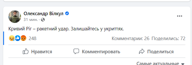 Як повідомив Олександр Вілкул, начальник військової адміністрації Кривого Рогу, це був ракетний удар.
