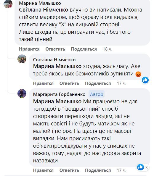 Наразі оголошення із сайту прибрали. Обурені ситуацією нікопольці запропонували волонтерам якось помічати видану гумдопомогу, щоб це було помітно. Втім, Маргарита зазначила, що це поодинокий випадок, а людей які наживаються на цьому, вони відразу вносять в "чорний список".