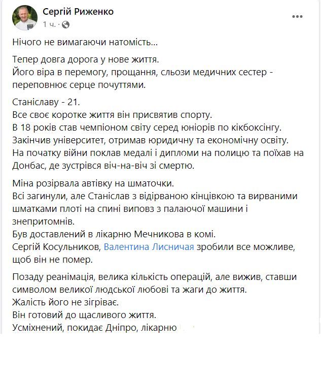 Позаду реанімація, велика кількість операцій, але вижив, ставши символом великої людської любові та жаги до життя. Жалість його не зігріває.Він готовий до щасливого життя. Усміхнений, покидає Дніпро та лікарню, - написав лікар.