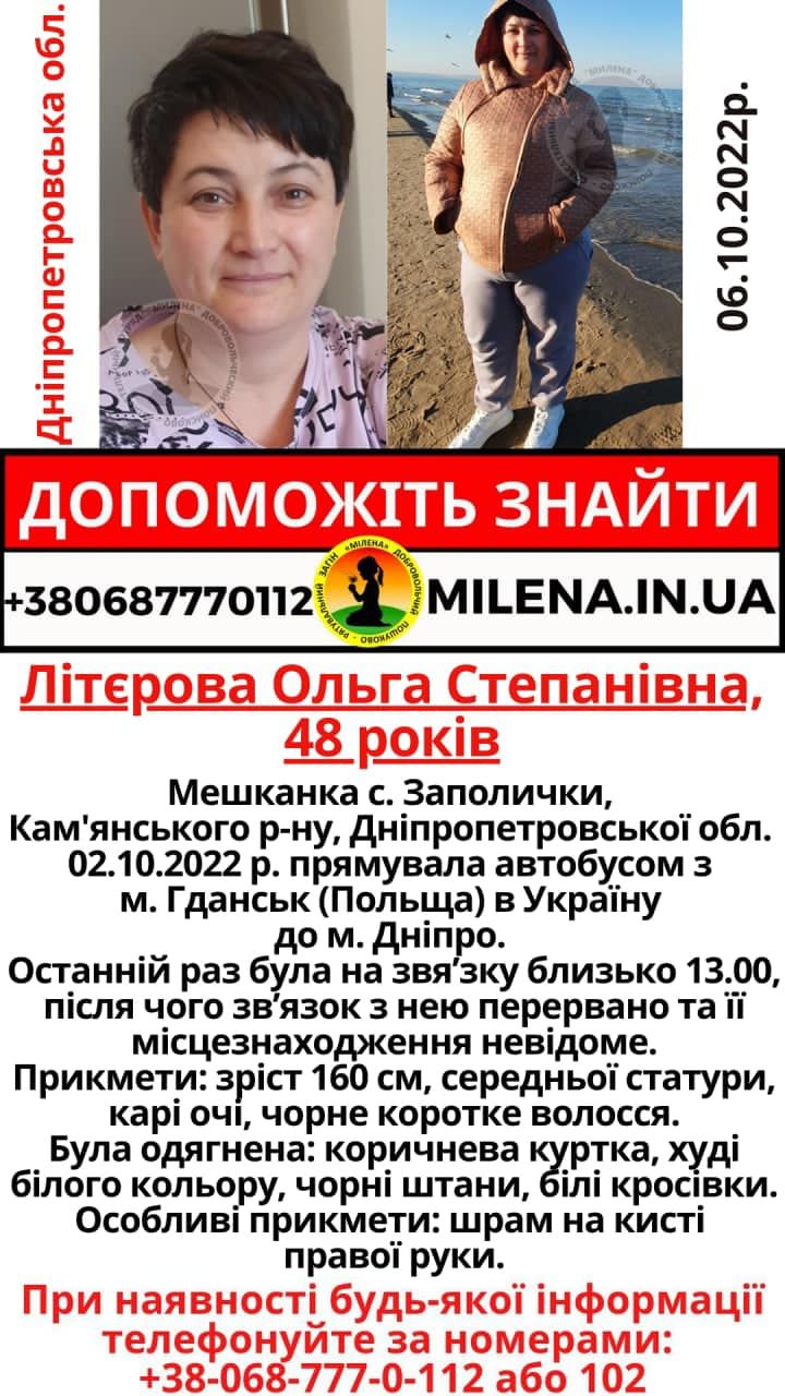 Відомо, що 2 жовтня жінка виїхала автобусом з Польщі у Дніпро та зникла. Останній раз Ольга була на зв’язку того дня близько 13:00. Де вона знаходиться зараз — невідомо.