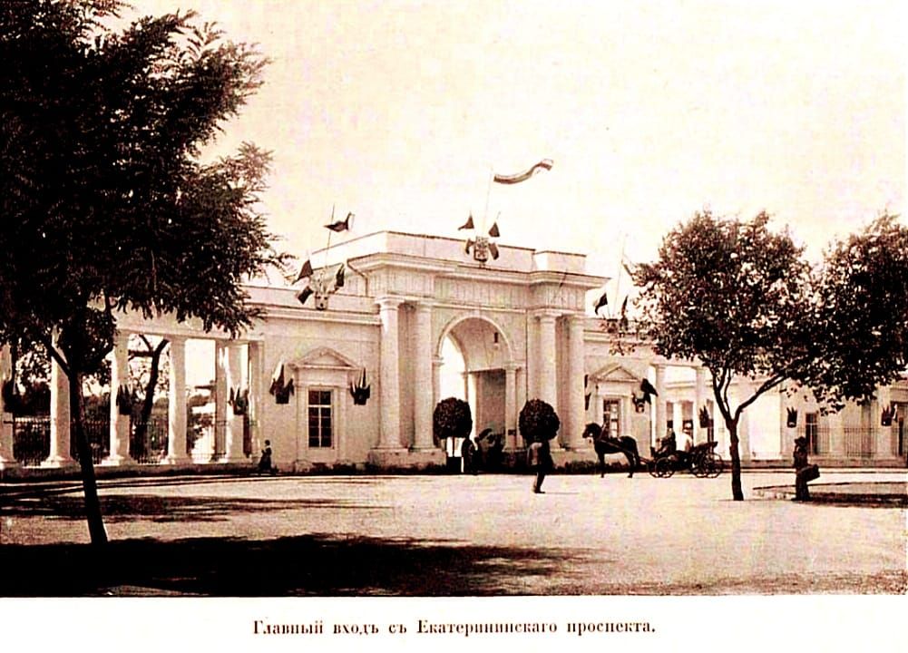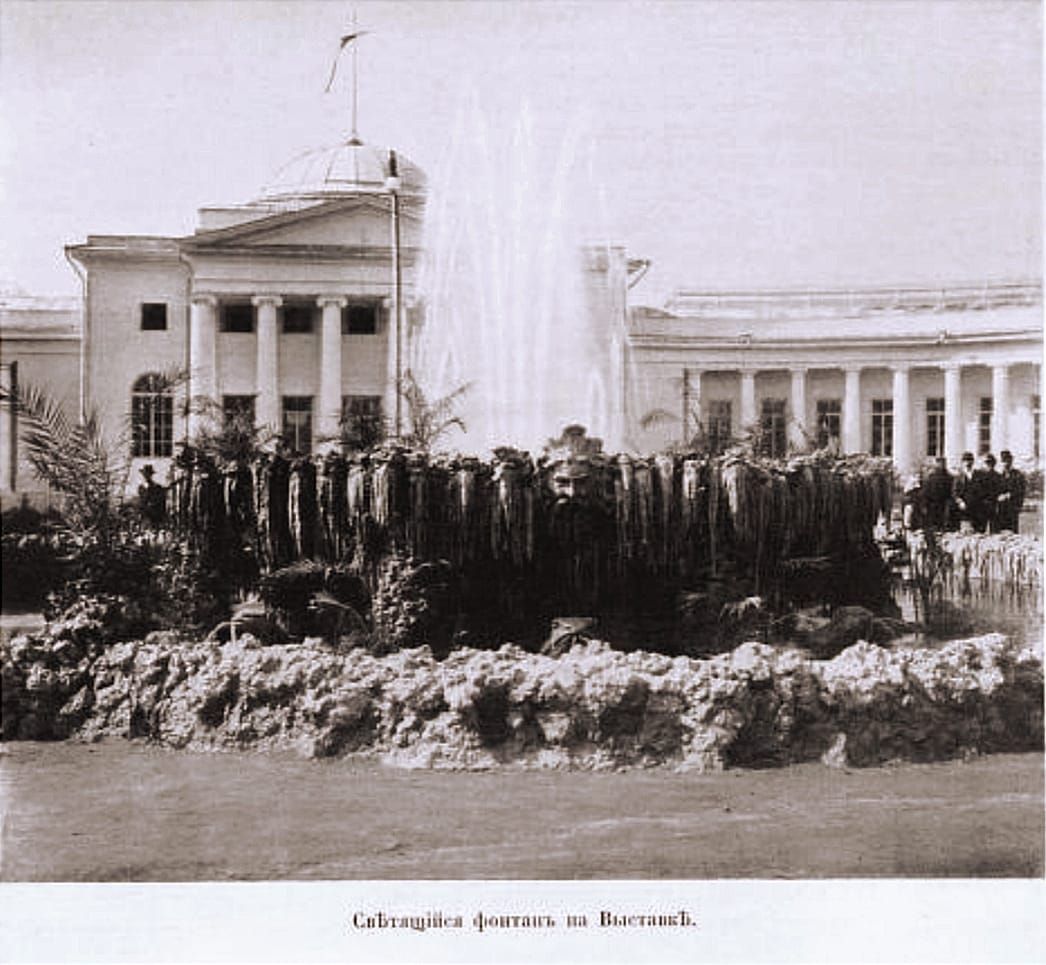 На іншому фото видно головний павільйон Південно-Російської виставки в Технічному саду. Спеціально для таких заходів створили світловий фонтан, який встановили перед входом.