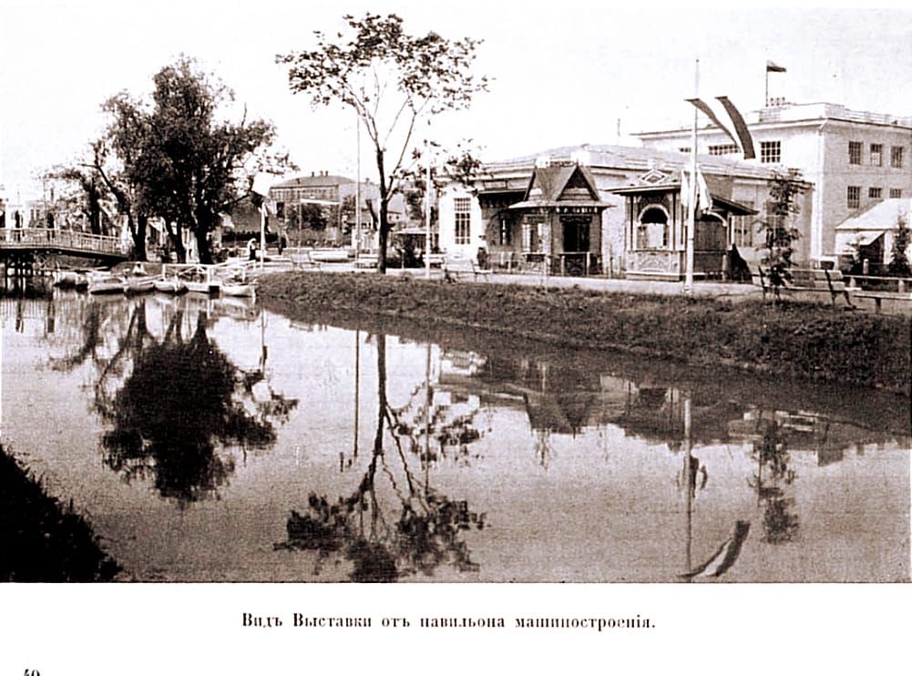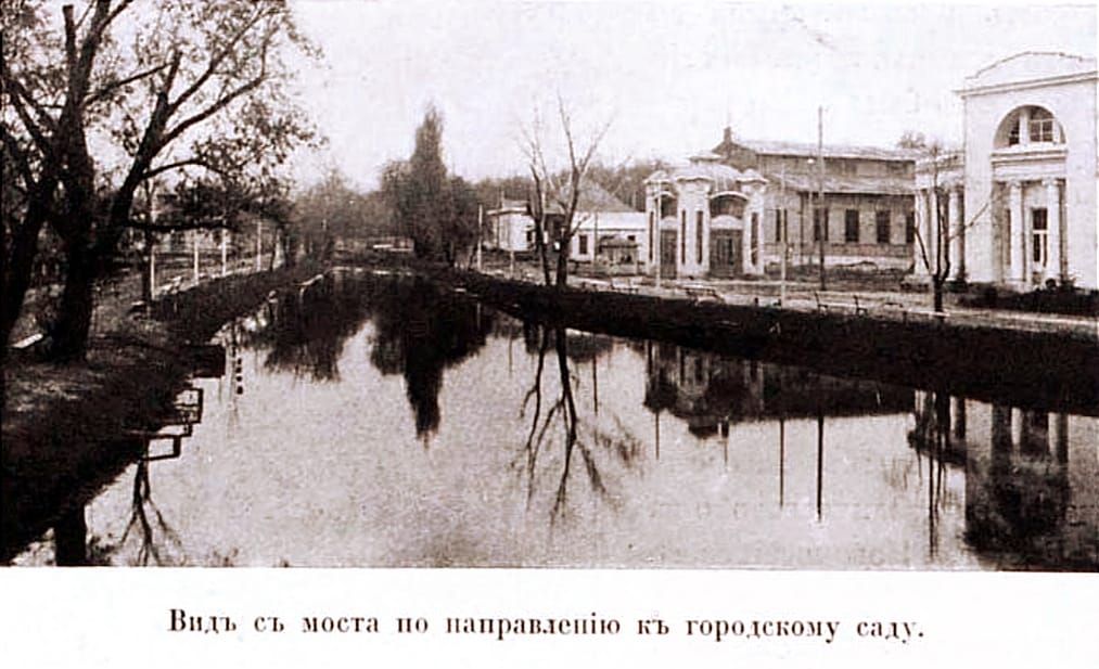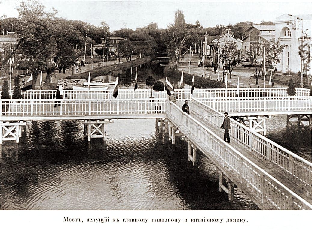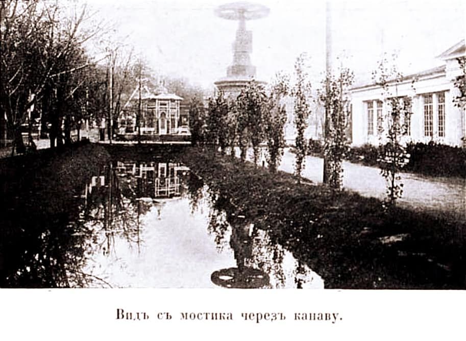 На фото зафіксована лише права сторона парку, від пішохідної дороги і до вулиці Сєрова. У частині, яка називалася Технічним садом, було багато водойм-каналів та ставок. Через них пролягав дерев’яний міст.