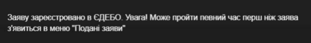 Після заповнення всіх полів необхідно натиснути «Подати заяву» та «Підтвердити». Якщо все було заповнено правильно, на екрані з'явиться інформація, що заява зареєстрована з ЄДЕБО.