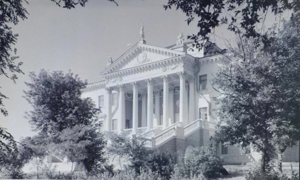 Перед палацом працював фонтан. На фото видно, що одразу після ремонту палац виглядав дуже красиво: з білими перилами, чистим фасадом, гарними сходами та невеликою клумбою з квітами перед будівлею.