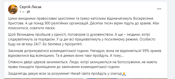 У ці дні всі працюватимуть у посиленому режимі. Особисто буду на зв’язку 24/7. Бо безпека у пріоритеті. Закликав дотримуватися комендантської години. Нагадую, вона не відміняється! - зазначив Сергій Лисак.