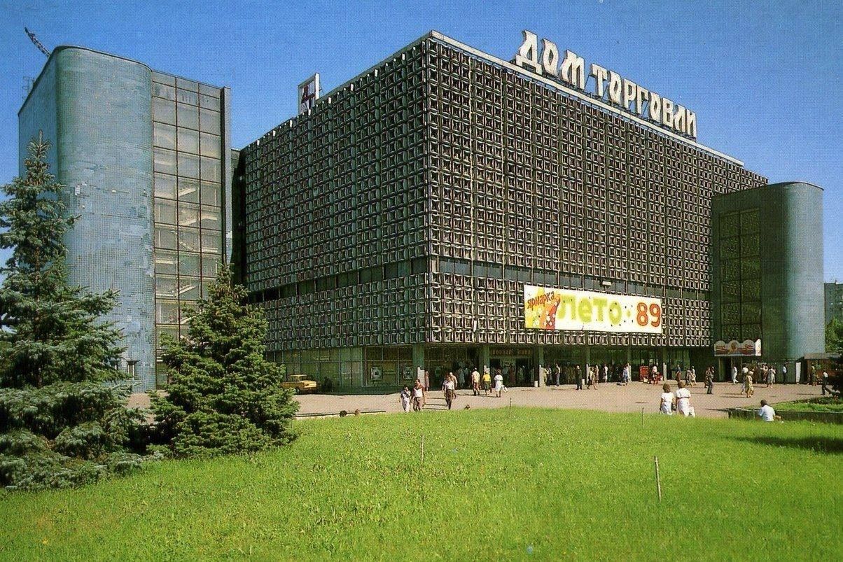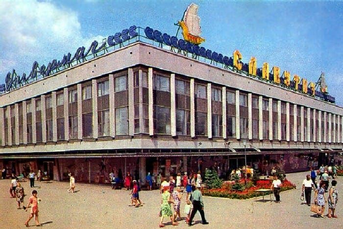 А це ще один сучасний торговельний центр на той час. Універмаг «Славутич» знаходився на правому березі Дніпра. Зараз він, як і раніше, працює, будівля пережила реконструкцію.