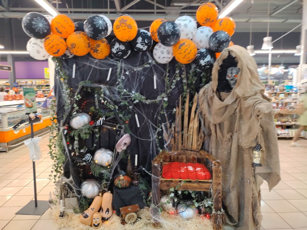 Частина продуктових супермаркетів вирішили не відставати та також обладнали місце для хеллоуїнського фото відвідувачів.