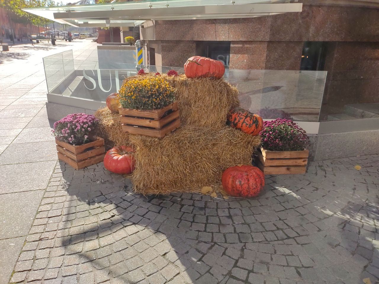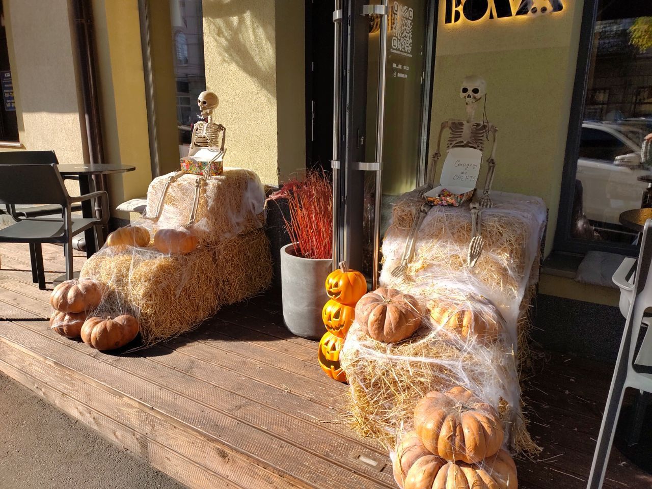 Частина магазинів та закладів виставили декор надвір - така фотозона у гарбузах є на Південному бульварі.