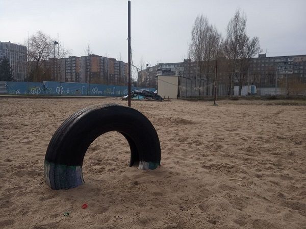 Закопане наполовину колесо та дві іржаві стійки для сітки – ось і вся розважальна інфраструктура на ньому.
