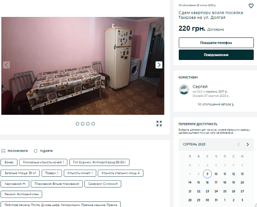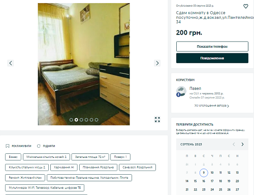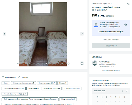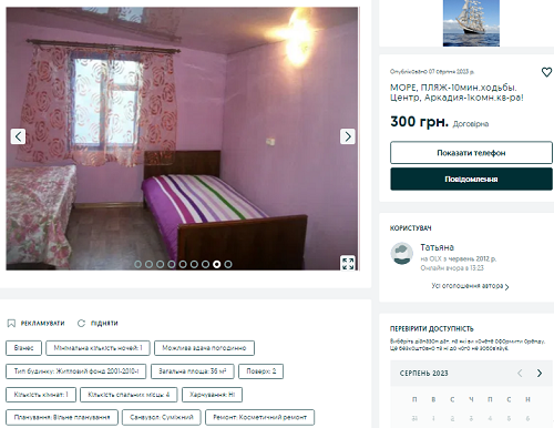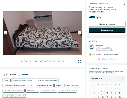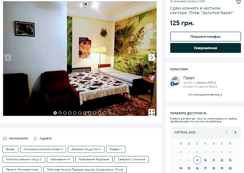 Найдешевша кімната знайшлася за ціною 125 грн з особи. Розміститися в ній зможуть до трьох осіб, тобто за добу трьом доведеться віддати 375 грн, а двом – 250. Мінімальний термін оренди приміщення – 5 днів. У кімнаті є спальні місця, телевізор, бездротовий Інтернет. Всі зручності у будинку. Також у розпорядженні квартирантів буде холодильник, плита, пральна машина. У дворі є автостоянка. Як стверджує автор оголошення, до пляжу 10 хвилин пішки.