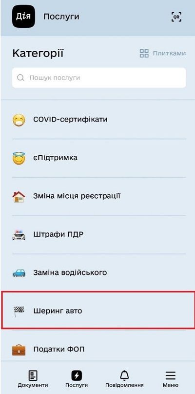 Поділитись цифровою версією техпаспорту авто можна тільки тим, у кого він відображається у застосунку. Здебільшого власники машин, які були придбані після 2013 року мають цю «опцію». Тож у застосунку спочатку потрібно пройти ідентифікацію, а потім перейти в розділ «Послуги» та обрати пункт «Шеринг авто», а після нього – «Поділитись авто».