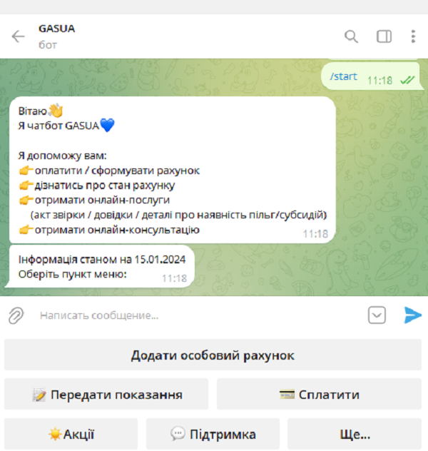 Передавати покази можна також через чат-бот компанії. Також за його допомогою можна сформувати та сплатити рахунок, дізнатися про стан рахунку, отримати онлайн-послуги, консультацію.