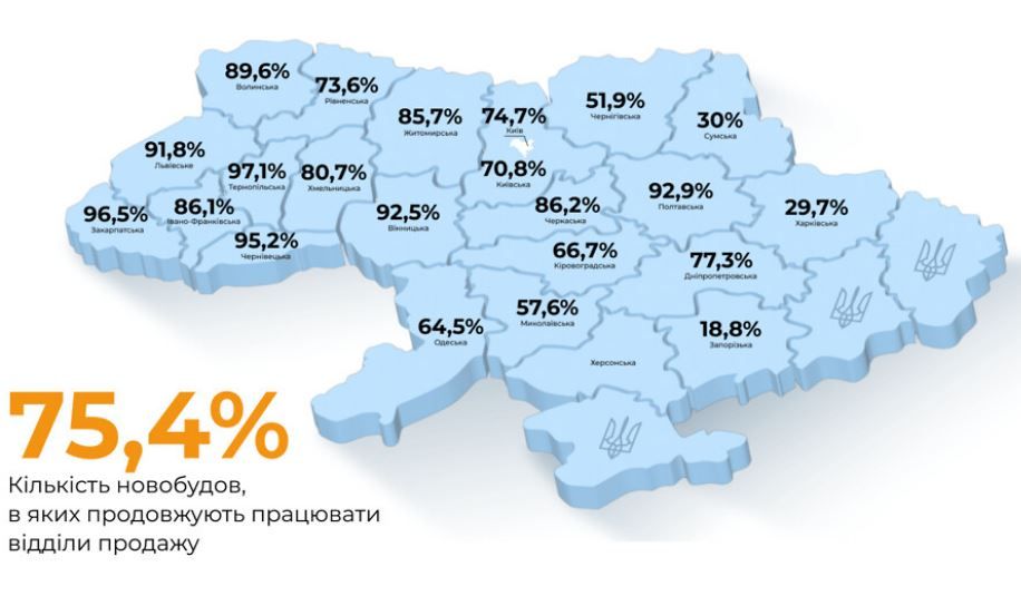 У Дніпрі та області відновили будівництво 77% новобудов, роботи в яких припинили після 24 лютого. Це найвищі показники на сході та півдні України, якщо не зважати на сусідню Полтавську область, де відновили 92,9% відділів продажу.