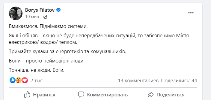 Вмикаємося. Піднімаємо системи. Як я і обіцяв – якщо не буде непередбачених ситуацій, то забезпечимо Місто електрикою/ водою/ теплом. Тримайте кулаки за енергетиків та комунальників. Вони – просто неймовірні люди. Точніше, не люди. Боги, - написав Борис Філатов.