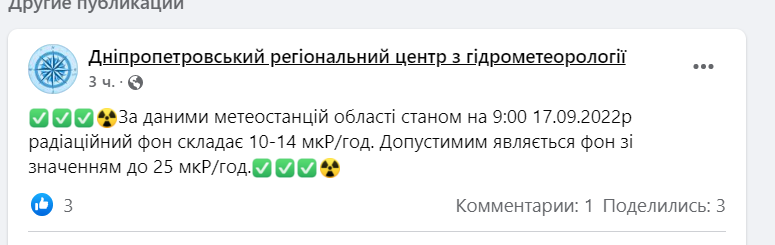 Який радіаційний фон у Дніпрі та області станом на 17 вересня