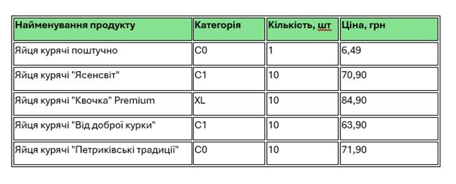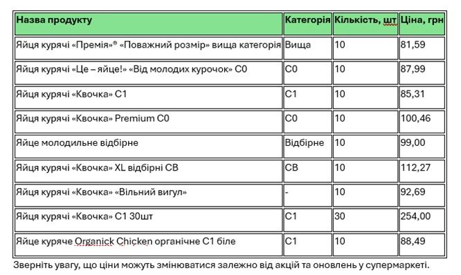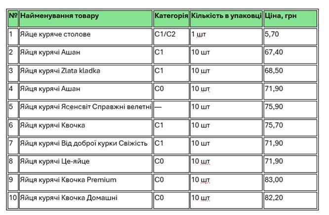 ✅ Діапазон цін: Вартість десятка курячих яєць у місті варіюється від 50,70 грн до 100 грн, залежно від бренду, категорії та магазину.