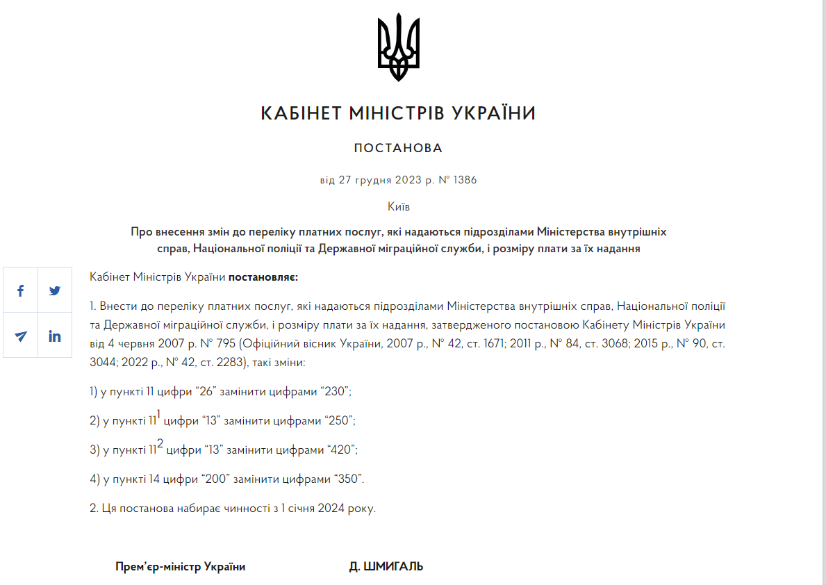Про це стало відомо з постанови Кабміну №1386 від 27 грудня "Про внесення змін до переліку платних послуг, які надаються підрозділами Міністерства внутрішніх справ, Національної поліції та Державної міграційної служби, і розміру плати за їх надання".