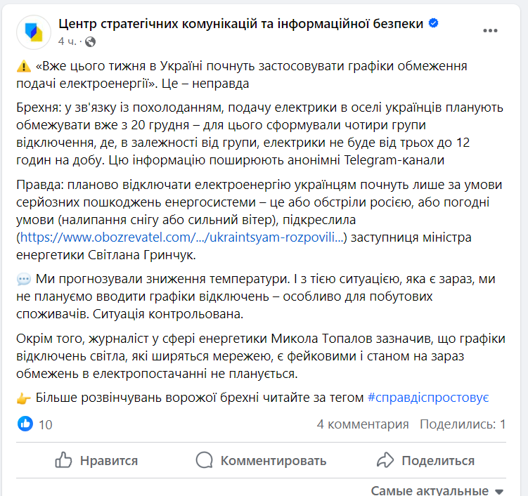 Анонімні Telegram-канали поширюють інформацію про те, що у зв'язку із похолоданням з 20 грудня в оселі українців планують обмежувати подачу електрики. Зазначається, що нібито світло вимикатимуть від трьох до 12 годин на добу.