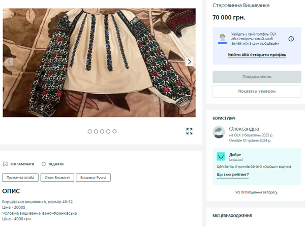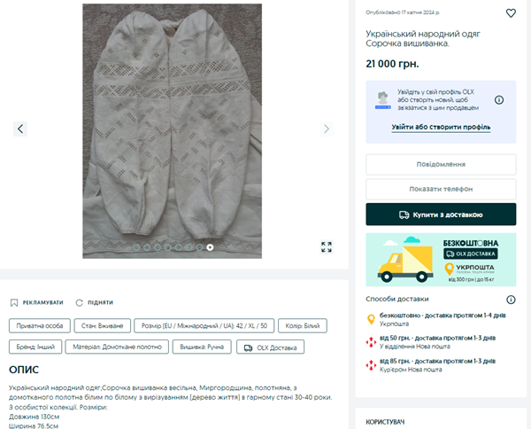 Вишита сорочка в техніці білим по білому коштуватиме 21 тис грн. Як зазначає автор оголошення, матеріал вишиванки – домоткане полотно, малюнок виконаний у традиційній для Миргородщини техніці, вишита вона була понад 30 років тому.