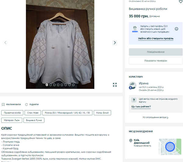 За 35 тис грн в Україні можна купити жіночу вишиванку ручної роботи. На ній є візерунки вишиті за допомогою технік «лічильна гладь», «солов'їні вічка», «курячий брід». Тканина – льон.