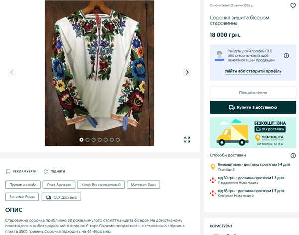 Вишиванку вишиту не нитками, а бісером в Україні продають за 18 тис грн. Сорочка з домотканого полотна вишивали її близько 30 років тому. Як зазначає автор оголошення, на вишиванці вишитий рідкісний візерунок, матеріал сорочки – льон.