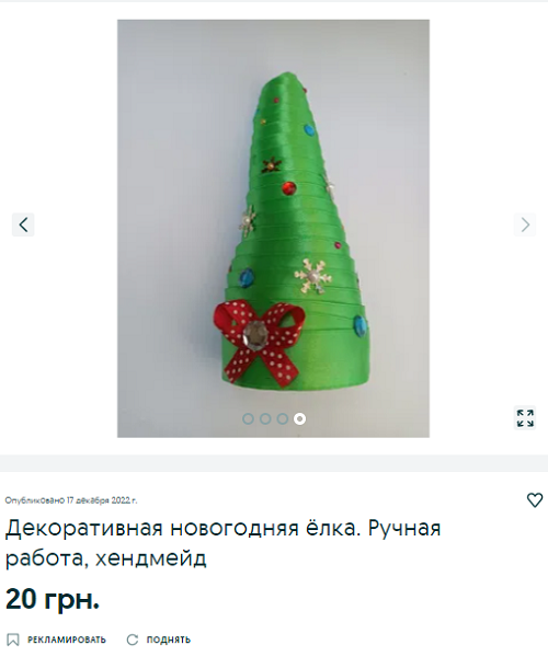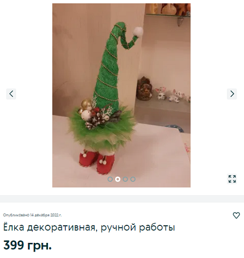 Невелика ялинка ручної роботи з різних тканин та з «ніжками» обійдеться в 399 грн. Висота такого дерева – 40 см. Виглядає дуже незвично, на ньому є новорічні кулі, намисто і навіть шишки. За бажанням ялинка може бути не тільки традиційного, зеленого, а будь-якого іншого кольору.