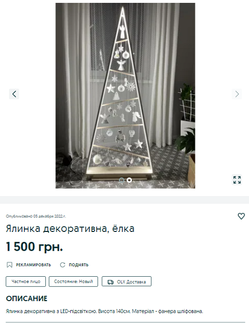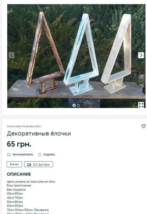 Дерев'яна ялинка у вигляді трикутника та без прикрас обійдеться у 90 грн. При цьому висота «дерева» буде 60 см. Якщо потрібно вище – просять дорожче, за метр потрібно буде віддати 250-300 грн. Щоб ялинку пофарбували, потрібно доплатити ще 30-60 грн.