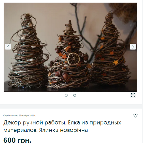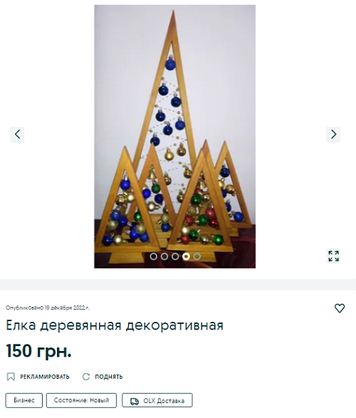 Для тих, хто собі не уявляє ялинки без прикрас, нехай вона і буде дерев'яною, також є варіанти. Наприклад, за «дерево» у ті ж 63 см заввишки, але вже з новорічними кульками та гірляндами потрібно віддати 250 грн. «Трикутник» вдвічі менше коштуватиме 150 грн. Матеріал, з якого виготовлена «ялинка» - сосна.