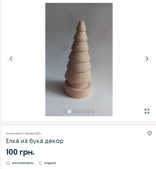 Ялинка, формою схожа на справжню маленьку сосну, але при цьому вирізана з бука обійдеться в 100 грн. На ній немає прикрас, вона незвичного бежевого кольору, а висота виробу 14 см.
